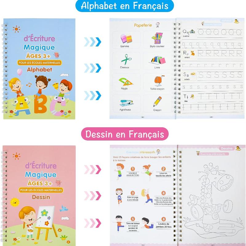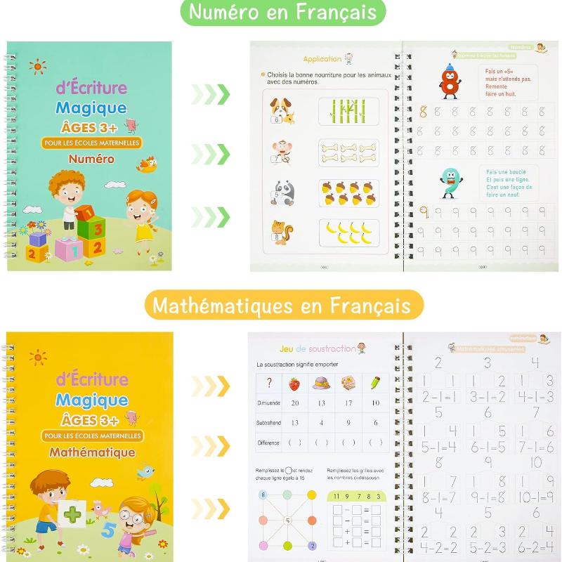Chaque Pack comprend un lot de 4 cahiers magiques: Lettres, Alphabet, Numéros, Mathématiques et Dessin. Mais aussi :1 stylo magique, 5 recharges d'encre magique qui s'efface en 10 minutes, et 1 grip de maintien du stylo.